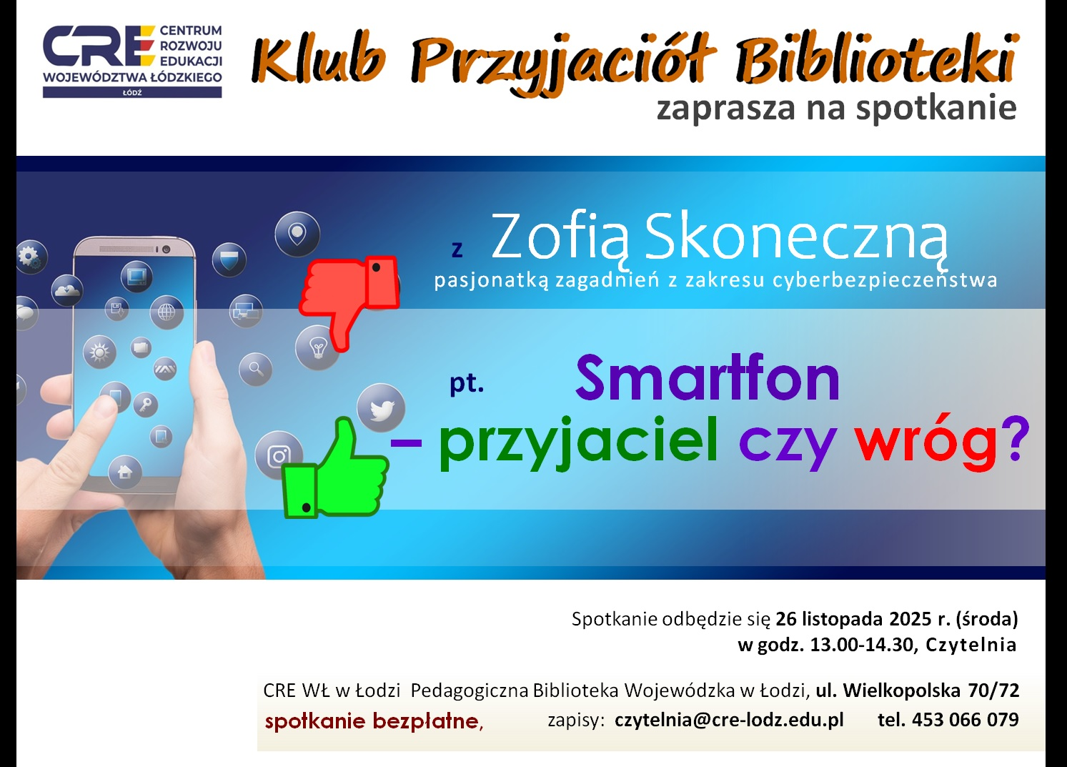 Klub Przyjaciół Biblioteki zaprasza na spotkanie nt. "Smartfon - wróg czy przyjaciel?".